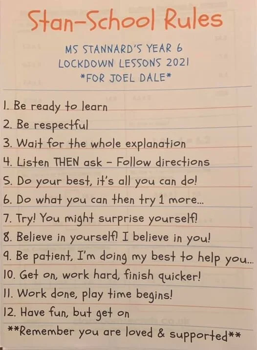 I think that Steph’s rules just indicate how important it is to set expectations both ways in the teaching process. Steph isn’t a teacher, but the messages in these ‘rules’ are so reassuring for a child and for me I think that the important thing is that as parents we should articulate what our children should expect from us as well as what we should expect from them. Setting boundaries are important and for some children reassuring. I don’t know if Steph did this but it could be a good exercise to put this list of rules together with your child with suggestions from you and them. This would promote ownership for both parties in this remote learning process.