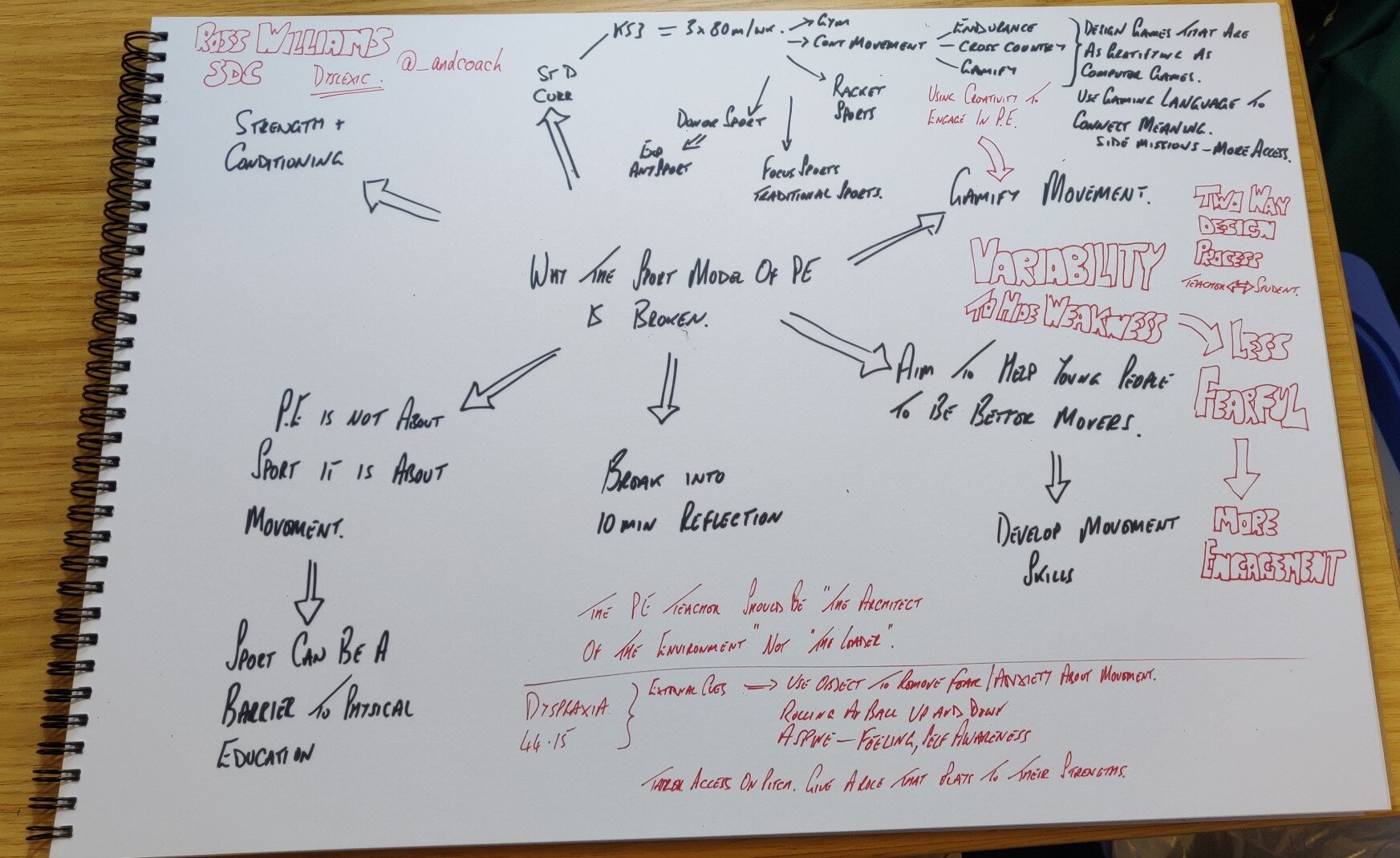 For starters, you can see from this picture of my notes below how engaged I was with the thoughts about how the sport model of P.E is broken and how it can be a barrier to engagement. This was my experience and I think perhaps the experience of many neurodiverse students who not only struggle with aspects of dyslexia in class but also in a P.E lesson when movement can be a challenge especially when the class is run from a competitive perspective.