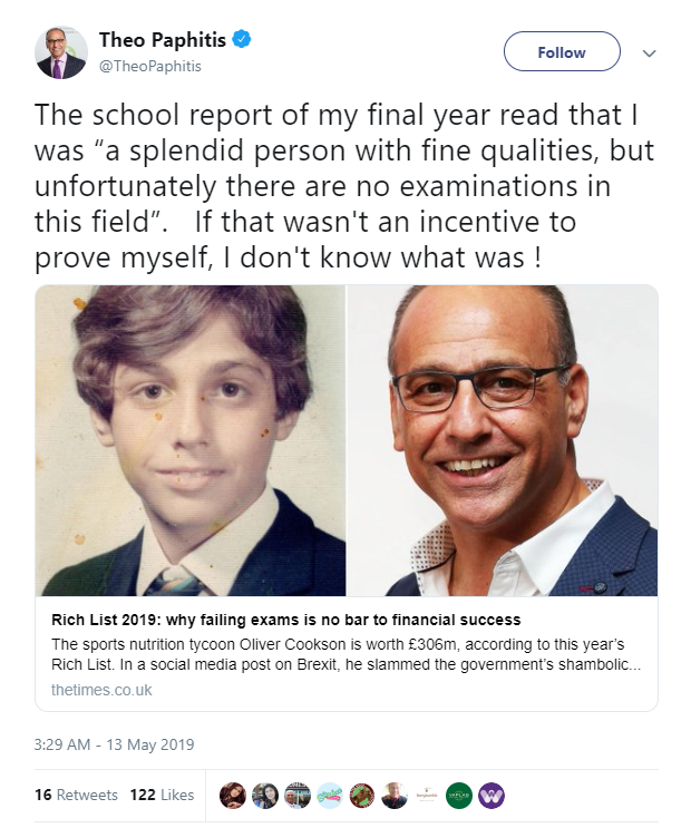 Theo said the following in a recent article from the Times about members of the Times Rich List who were not high achievers at school:
