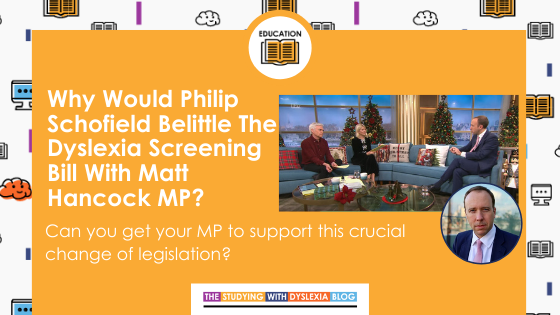 Why isn’t dyslexia awareness taken more seriously? With the ‘quiet scandal’ of dyslexia taking place amongst our children in schools, why would the likes of Phillip Schofield deliberately switch off the spotlight on this need when interviewing MP Matt Hancock about the launch of the Dyslexia Screening Bill?